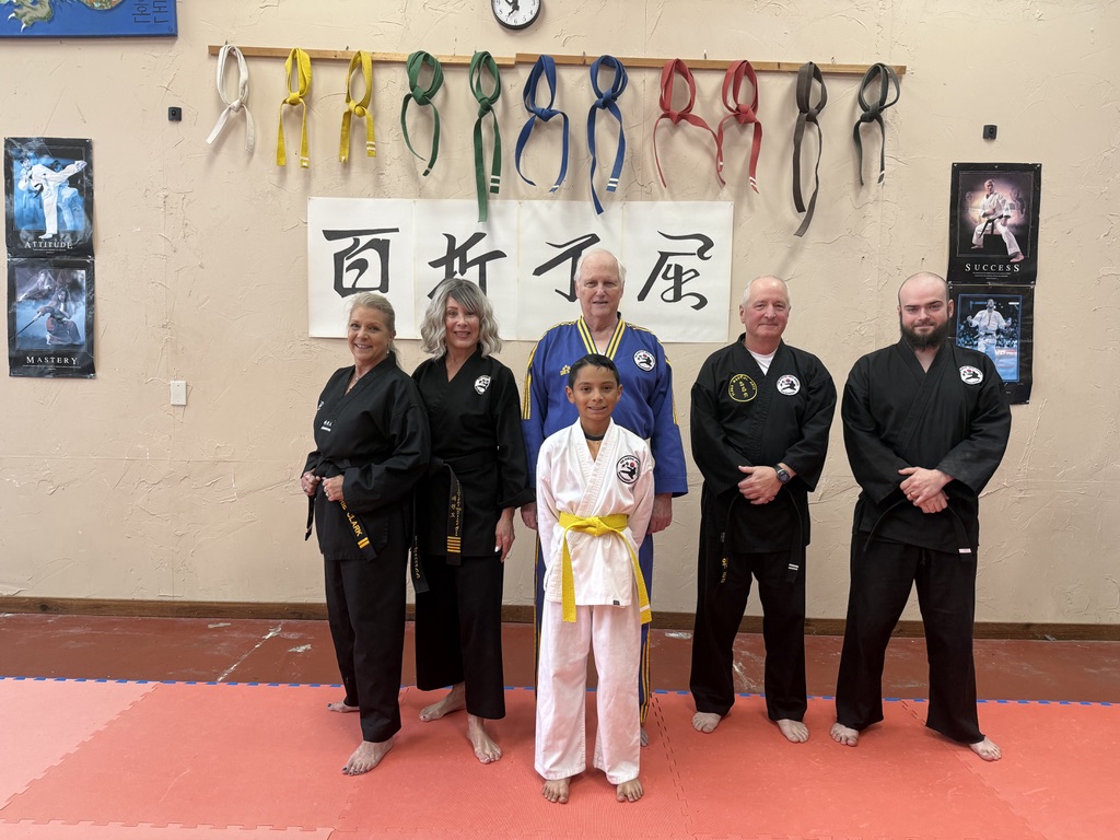 The Whitewright Martial Arts Center is pleased to announce the promotion of Dylan Zavala to First Yellow belt in Taekwondo. His test was performed on Saturday, Jan. 10, 2026 at 9AM and he performed excellently. His techniques were strong and correct. He had very good focus and showed great respect for the members of the review board. He had trained long hours to achieve this rank. There were five black belts on the review board including myself and we all agreed that his test was the best yellow belt test performance that we had seen in a very long time. The reviewers from left to right were: Lorie Stacey, 2nd degree black belt, Master Barb Norrell, fifth degree black belt, myself, Master Roger Howe, sixth degree black belt, Jimmy Wortham, second degree black belt and River Diehl, first degree black belt. If he continues down the path of Taekwondo, he will continue to increase his skills and become stronger in the martial art. When you see him, please congratulate him on his promotion. Very well done, Dylan!